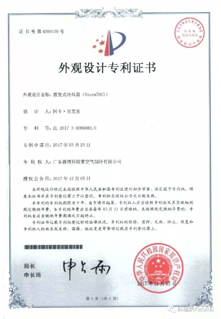 近期,科瑞萊冷風(fēng)扇產(chǎn)品"風(fēng)暴"憑借精美的外觀和優(yōu)良的品質(zhì),榮獲國家知識(shí)產(chǎn)權(quán)局頒發(fā)的外觀設(shè)計(jì)專利證書。